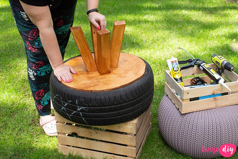 Aby zapewnić stabilność kwietnika, należy przymocować okrągłą płytę wiórową do wewnętrznej strony opony, a opcjonalnie dodać drugą płytę z zewnątrz. Dobrze mocowane płyty zapobiegną zachwianiu się całej konstrukcji.